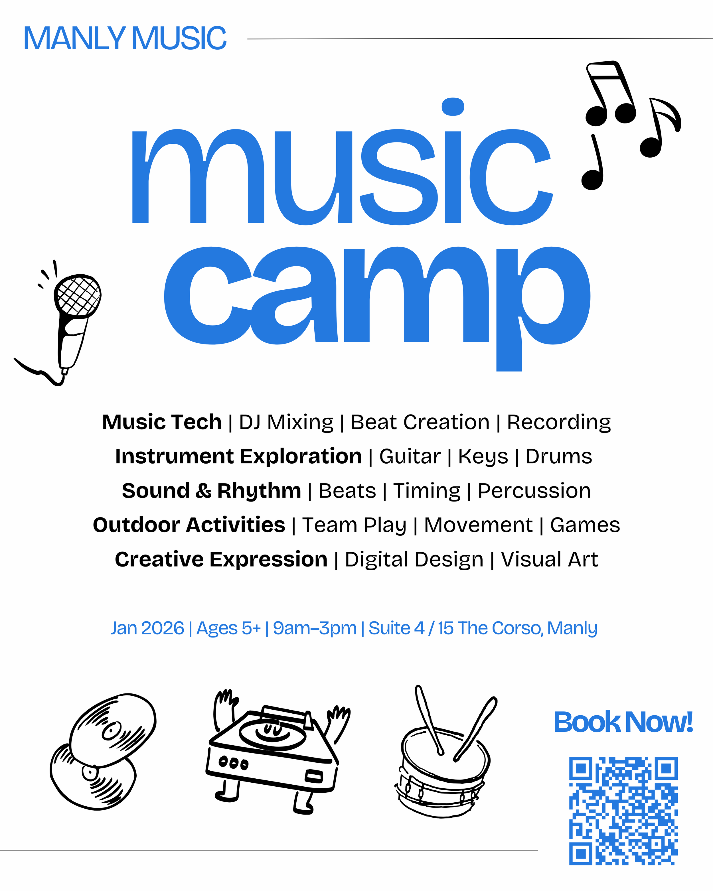 Please note: photography and video content will be captured on this day for Manly Music promotional use.Please complete a booking for one child and include the friend’s name and contact number in the comments. We will then send the friend a 100% discount code to complete their free booking.